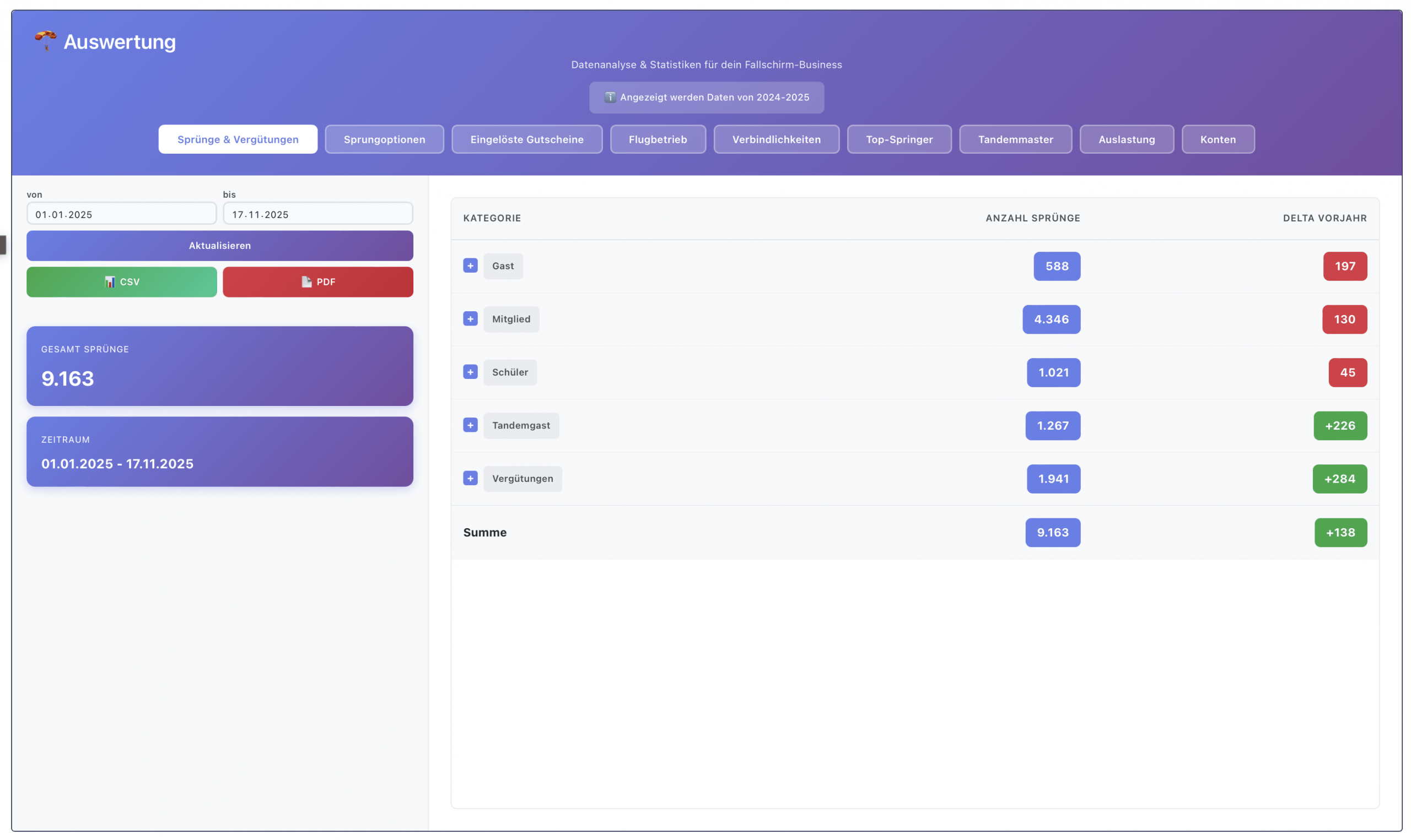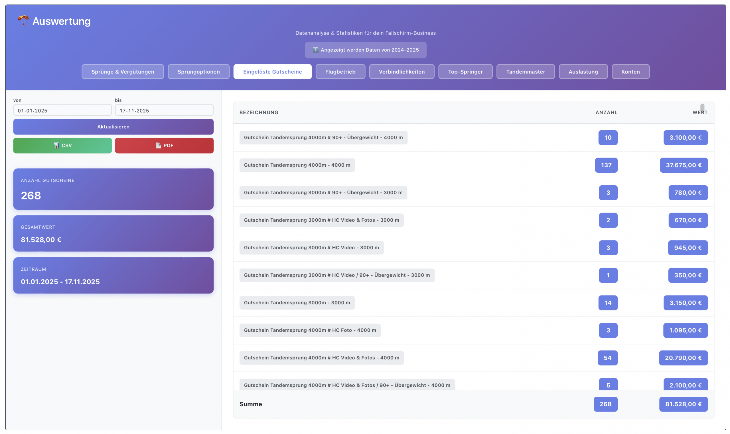 - bestellte und eingelöste Tandemsprung-Gutscheine,
