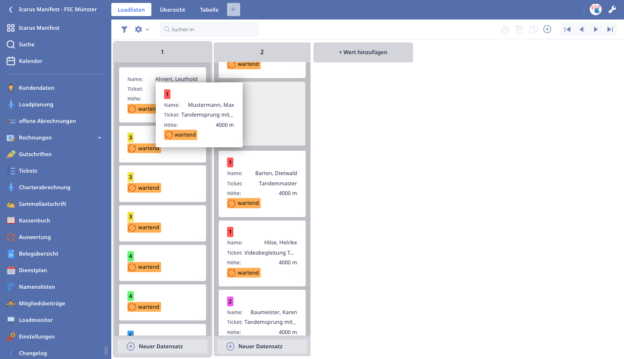 Die Oberfläche zeigt in Spaltenform alle Loads an, die sich im Status WARTEND oder IN DER LUFT befinden. Loads bzw. Sitzplätze im Status GELANDET werden ausgeblendet. Über den Button (+) am Ende jeder Spalte kann ein Sitzplatz dem jeweiligen Load hinzugefügt werden.